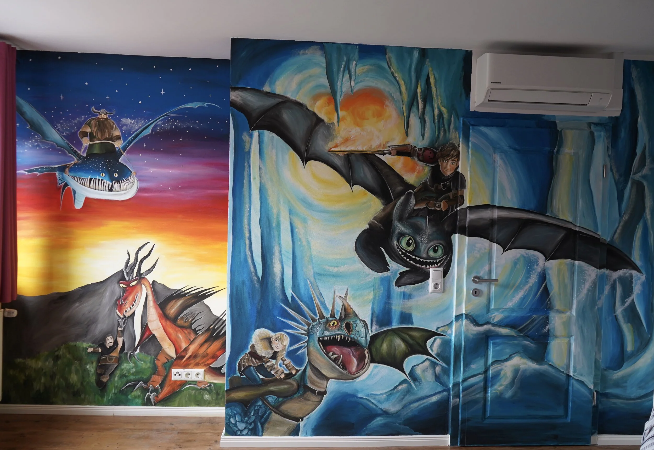 Drachenzähmen leichtgemacht Wandgemälde (Voll -und Abtönfarbe auf Rauputz)